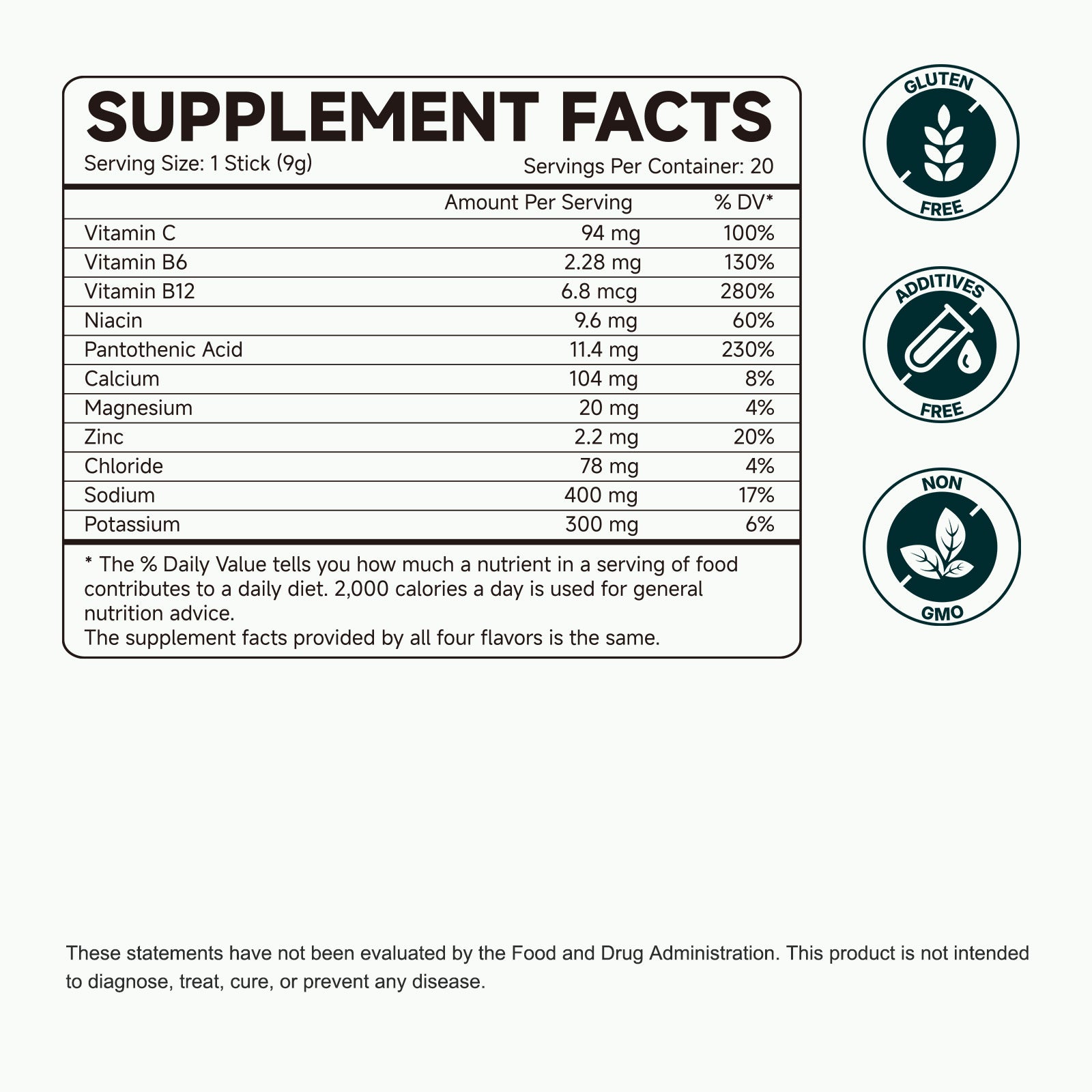 Each stick delivers the core hydration minerals you actually need: 400mg sodium and 300mg potassium, plus supportive electrolytes like chloride, calcium, and magnesium—with a light boost from vitamin C and B vitamins (B6, B12, niacin, pantothenic acid). Mix, sip, and move on—no complicated routine.
