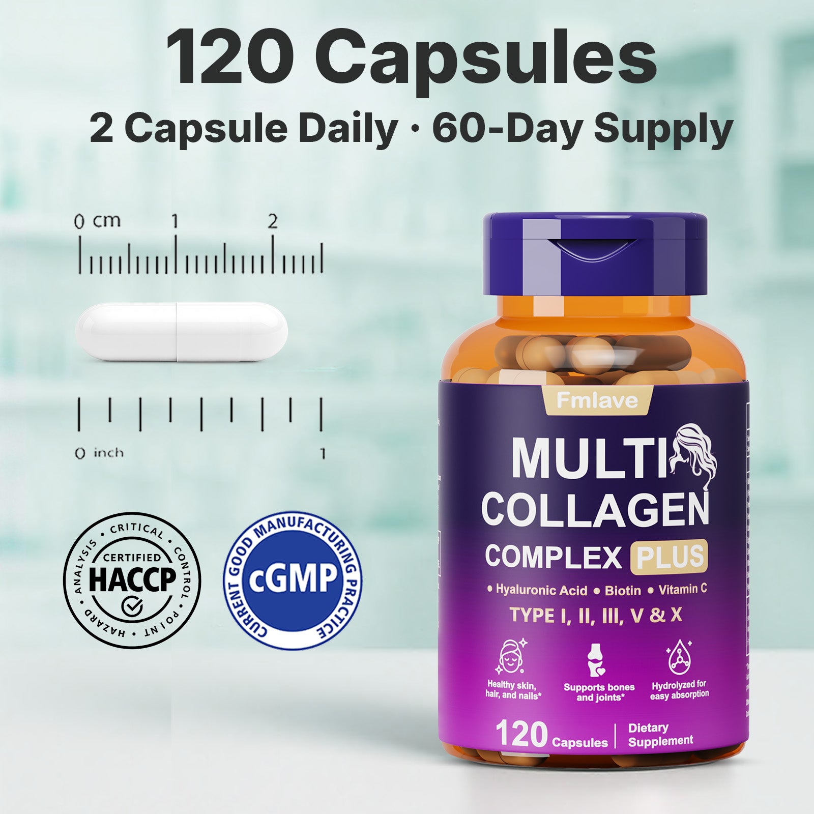 Fmlave Multi Collagen Complex Plus is a multi collagen supplement that goes beyond a basic collagen protein powder by combining five types of hydrolyzed collagen peptides in one easy capsule. This 5-source blend (bovine, fish, chicken bone broth, and eggshell membrane) is designed to support smoother skin, stronger hair and nails, and comfortable joints from the inside out.