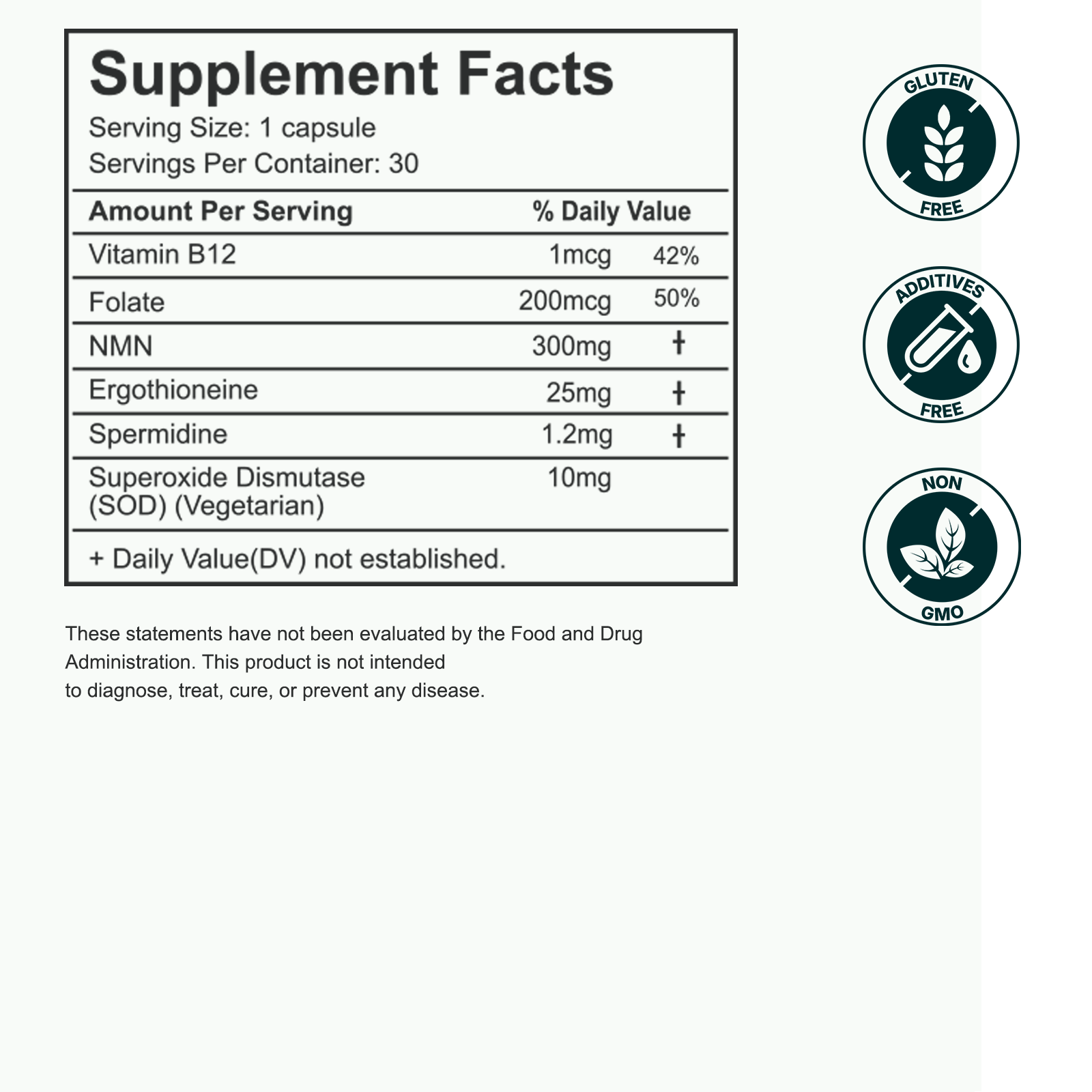 Because NMN, spermidine, ergothioneine, and SOD target pathways related to mitochondrial function, autophagy, and oxidative stress, maintaining adequate folate ensures that basic genomic and vascular processes are also supported. Its homocysteine‑lowering effect complements the formula’s broader aim of supporting vascular and cellular health over time, creating a bridge between advanced longevity‑oriented actives and essential B‑vitamin biochemistry [1–3,5].